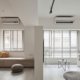 A light-toned palette combined with warm wood elements establishes a bright yet calming living atmosphere. At the entrance, a perforated wood veneer wall serves as a focal feature, merging display and storage. The ceiling design introduces layered wooden elements to subtly conceal structural beams while articulating the transition between living and dining areas.